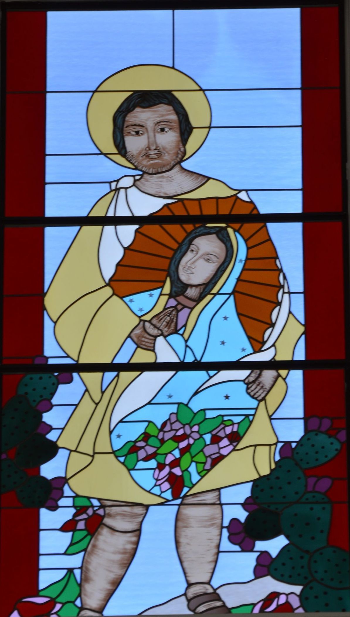 Our Lady of Guadalupe's beautiful shrine comes from the Basilica in Mexico City. Archeologists discovered a rare rock underneath Tepeyac Hill, from which they made the altar at the Basilica of Guadalupe. They gave our parish several large pieces of this newly discovered rock, which we placed underneath the altar in concrete as the foundation for the new church. We wanted to make this special connection between the Guadalupe events and the construction of our new parish church, which was built in 1993.